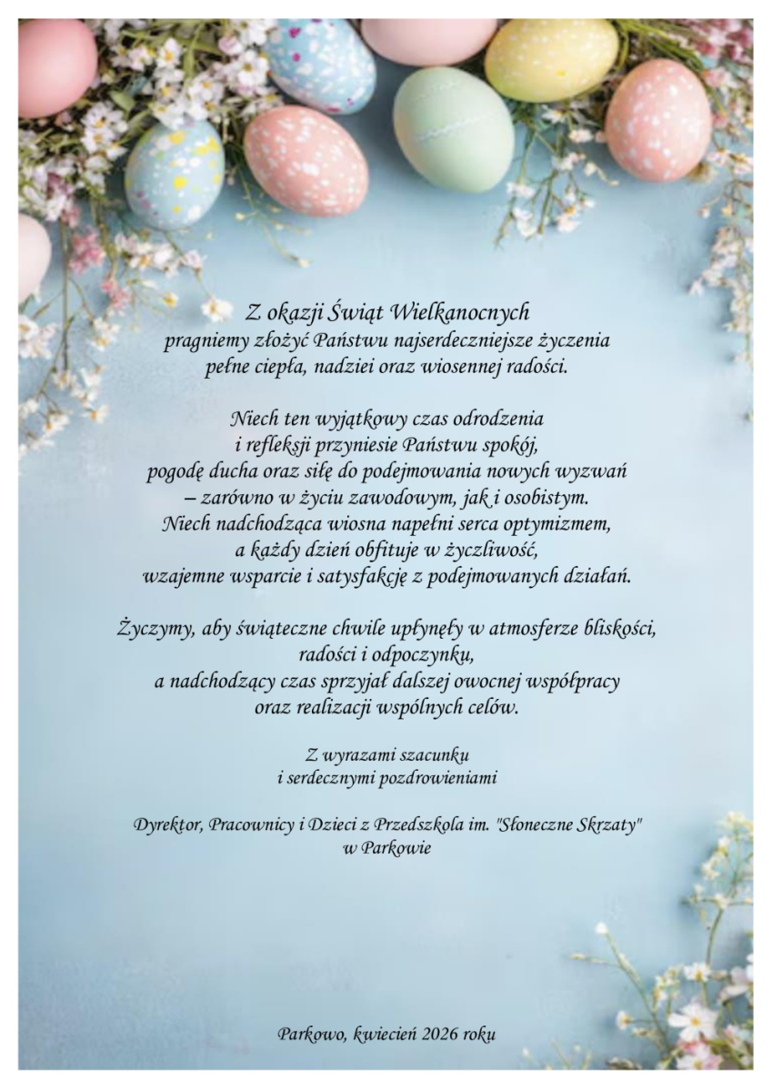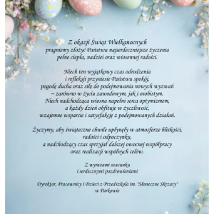 Szanowni Państwo, przesyłamy dla Państwa moc najserdeczniejszych życzeń z okazji zbliżającej się Wielkanocy.